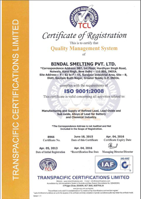 Our modern quality control Laboratory consists of Optical Emission Spectrometer (OES) of Spectro Germany make & Atomic Absorption Spectrometer (AAS). Our manufacturing operations to produce Pure Lead Metal/Lead Alloy, Lead Oxides (Litharge, Red Lead & Lead Sub-Oxide), Lead Products (Lead Sheets, Lead Pipes, Plates, Wires etc.) are controlled round the clock by experienced Chemists & Q.C. Supervisors. Bindal Smelting Pvt. Ltd. follows strict quality standards in all areas of operation right from selection of raw material to ultimate dispatch to its valued customers.
